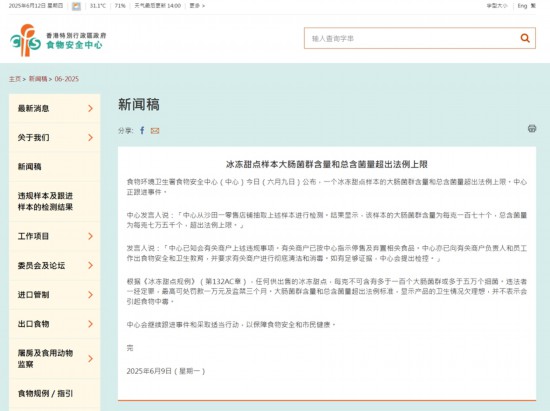 再看近期。本年6月9日,出格行政区食物卫生署食物平安核心发布旧事稿暗示,沙田一零售店肆抽取的冰冻甜点样本经检测,大肠菌群含量为每克170个,总含菌量为每克7。5万个,超出法规上限。此后,问题样本被发觉来自蜜雪冰城沙田好运核心店。按照出格行政区《冰冻甜点规例》,涉事样本的大肠菌群、菌落总数超出限值70%、50%。